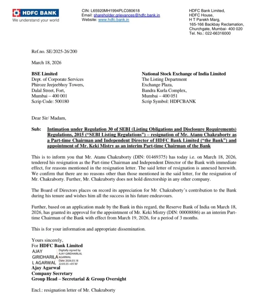 In a sudden move, HDFC Bank’s part-time chairman and independent director Atanu Chakraborty resigned with immediate effect on Wednesday.
